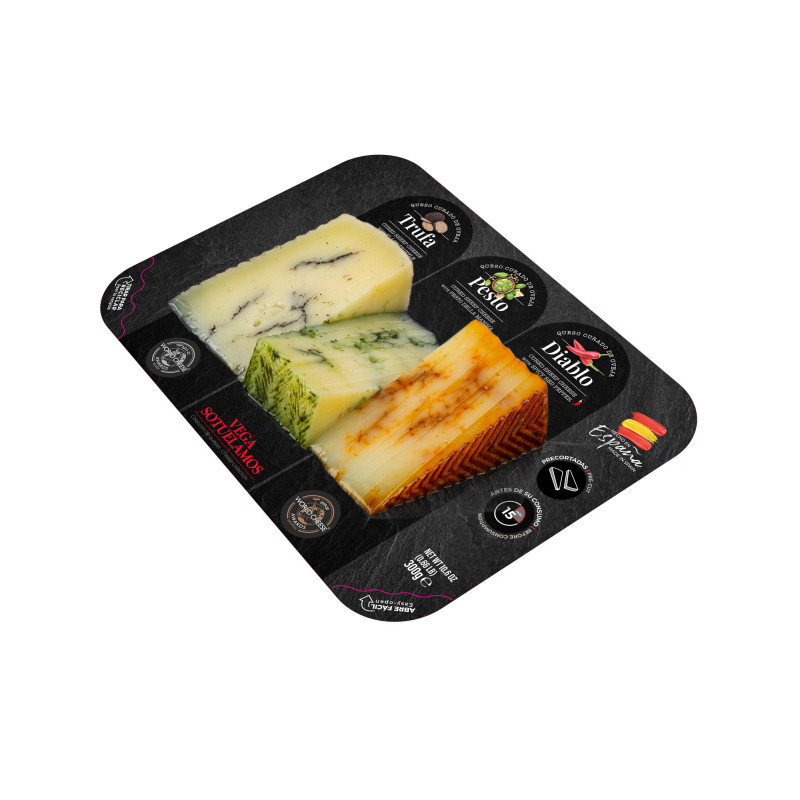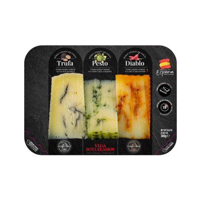 Tabla con cuñas de queso elaborado con leche de pasturizada de oveja en formato de 100g Trufa Negra, 100g de Pesto y 100g de Diablo